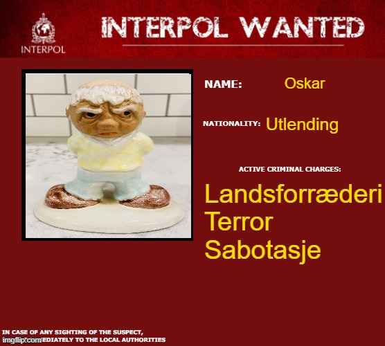Nordpolen sendte inn en forespørsel om rød notis til Interpol, etter at Oskar ikke møtte opp på innhentingsplassen. Denne har nå blitt godkjent og det drives nå en internasjonal jakt etter utlendingen.